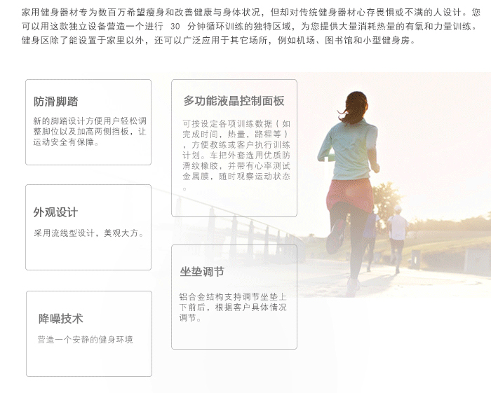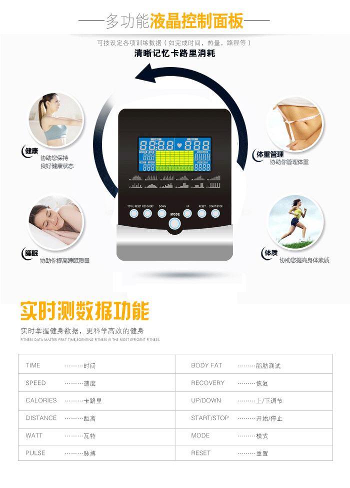 | 预设程序(LCD) | 距离倒计时模式,卡路里倒计时模式,时间倒计时模式 |