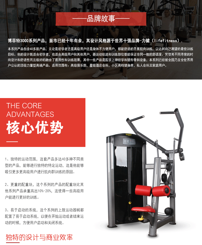 BFT3004高拉背训练器,高位下拉训练器,高拉背划艇 型号:BFT3004 价格:¥9960 产品占地尺寸: 1370*1410*1880mm 毛重/净重: ≥223/212kg 标准配重/最大配重: 8≥0/100kg 锻炼部位:背阔肌。 主要锻炼:菱形肌、三角肌、肱桡肌、腹外斜肌。 次要锻炼:髋部屈肌、腹直肌。 获取报价